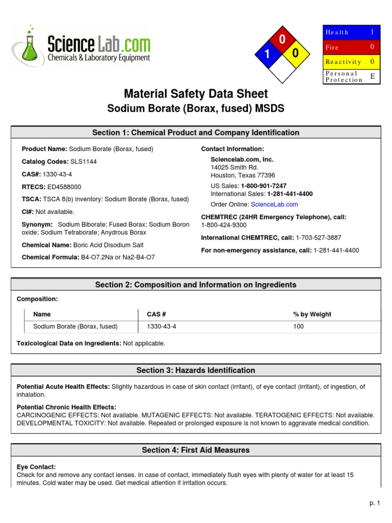 Safety Data Sheet - Fisher Sci Sodium Borate, Reagent Grade Created by Global Safety Management, 1-813-435-5161 - Density at 20°C: Not Determined SECTION 10: Stability and reactivity Reactivity: None Chemical stability: No decomposition if used and stored according to specifications. Possible hazardous reactions: Thermal decomposition. Conditions to avoid: PDF Borax Material Safety Data Sheet - mnclay.com Material Safety Data Sheet Borax 10 Mol 1. CHEMICAL PRODUCT AND COMPANY IDENTIFICATION Product Id: LA1995 Product Name: Borax 10 Mol Synonyms: None Chemical Family: None Known Application: Industrial manufacturing. Prepared By: The Environment, Health and Safety Department of Univar Canada Ltd. Preparation date of MSDS: 23/Apr/2014 Telephone number of preparer: 1-866-686-4827 Hazard Classifications | U.S. Borax Borax Decahydrate and Optibor industrial grade products (ie, Borax Decahydrate TG/TP, Optibor TG/TP) produced and packed in the USA have been GHS self-classified as toxic to reproduction Category 2 in the Americas and Asia-Pacific regions which we believe is the appropriate hazard classification warranted by the data. The exceptions are China where boric acid has a mandatory Cat 1B classification and South Korea authorities assigned a mandatory Cat 1B classification for boric oxide. Sodium Borate - Cosmetics Info Scientific Facts: Sodium Borate, also called borax, occurs naturally as the mineral, tincal, and Boric Acid occurs naturally as the mineral, sassolite. Both Sodium Borate and Boric Acid may also be obtained by treating other minerals such as kernite, ulexite, and colemanite.