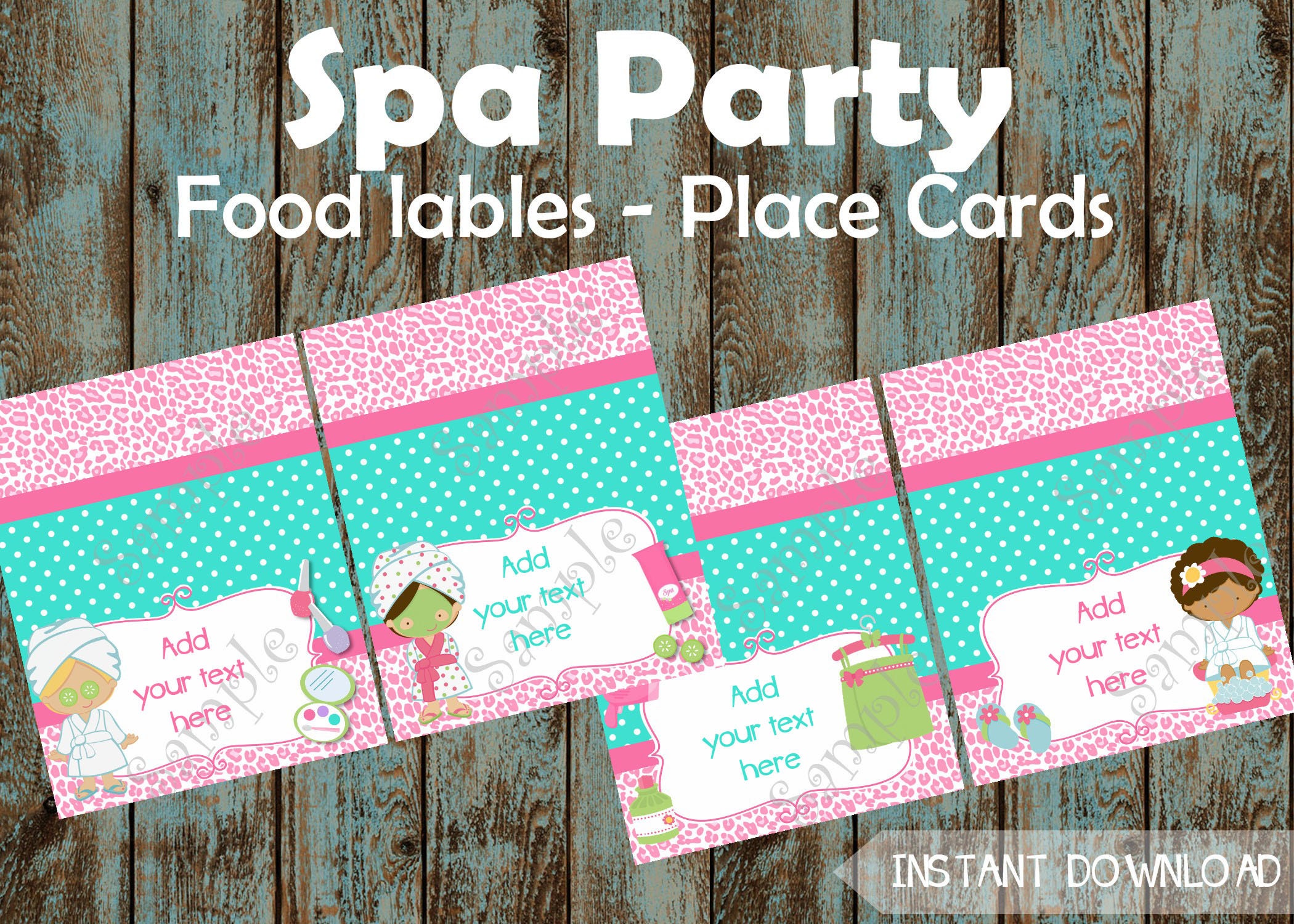 Spa Party - Printable Party Ideas Need spa party ideas. We've gathered together a menu, decoration, activity ideas and a bunch of links to recipes and tutorials to put it all together. ... You can find tent cards and labels to complete the look at our Etsy shop. Activity table. We covered the table with plastic table cloths. I'd been hunting for months before the party and ...